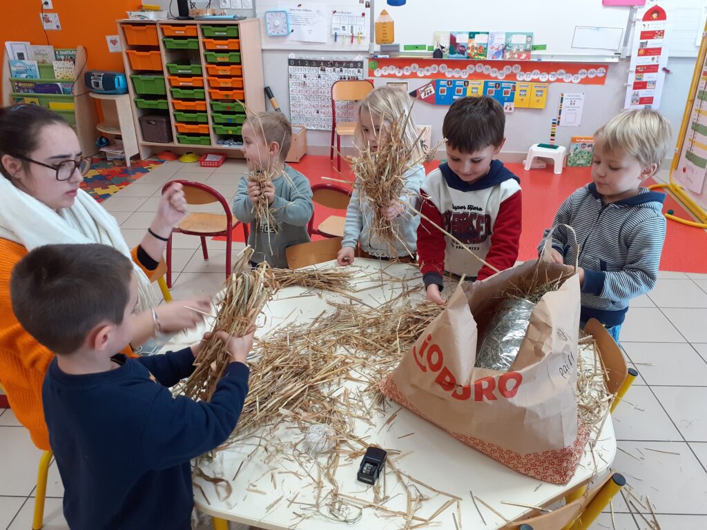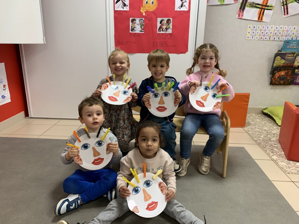 Le jeudi 27 novembre, nous avons fabriqué de drôles de bonhommes ! C’était l’occasion d’étudier les différents éléments du visage et de les compter : deux yeux,