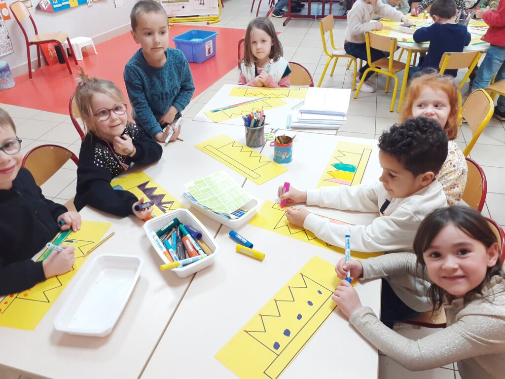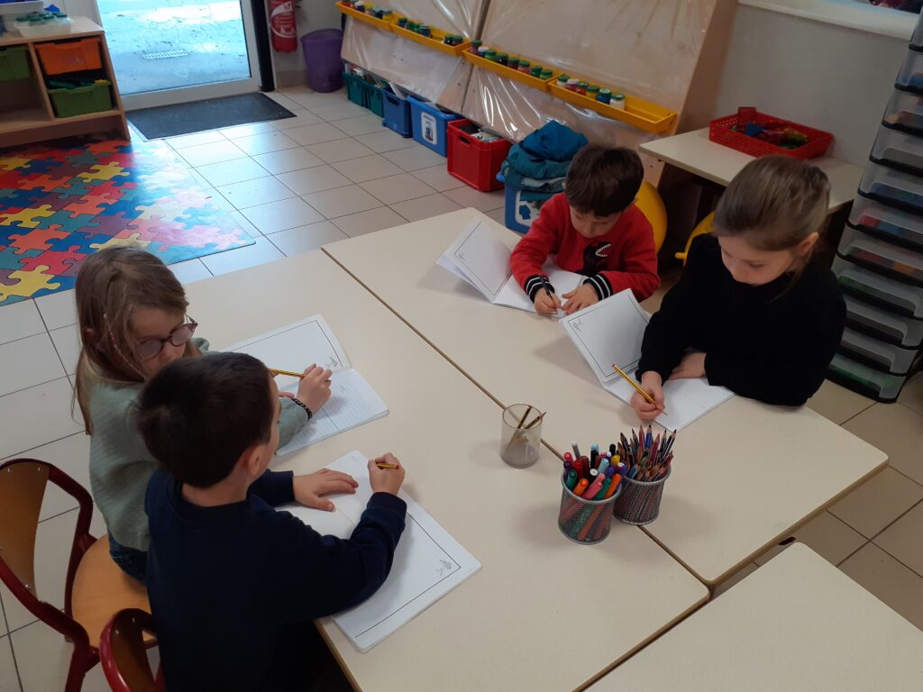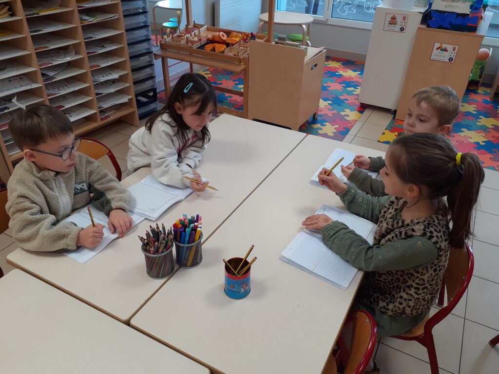 Ensemble, ils ont essayé d’écrire les mots nécessaires pour rédiger une recette de galette : sucre, pâte, poudre d’amande. Chacun a proposé des idées, tracé des lettres et réfléchi aux sons, découvrant ainsi le plaisir d’écrire pour de vrai.