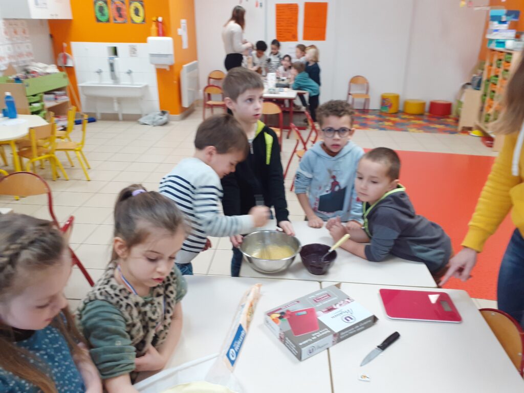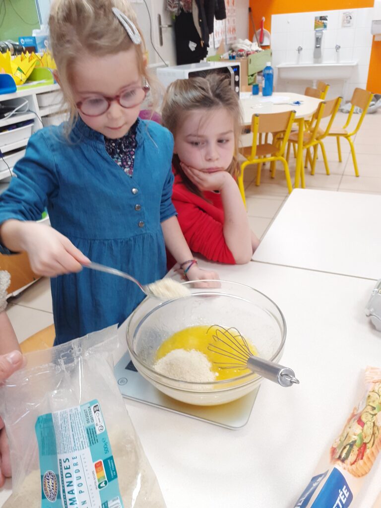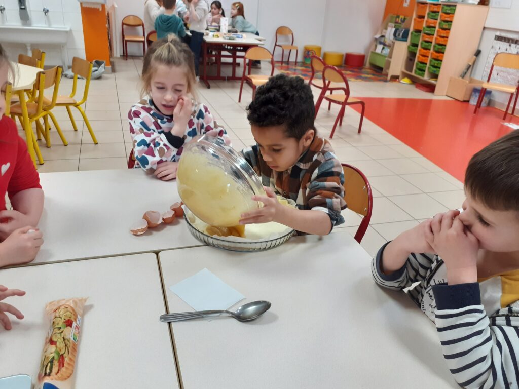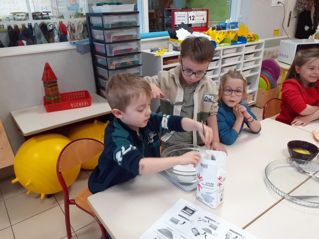 Une fois la recette terminée, place à la cuisine ! Les enfants ont mesuré, mélangé avant de cuire la galette. Un beau moment d’apprentissage où l’écriture, la coopération et la gourmandise se sont rencontrées !