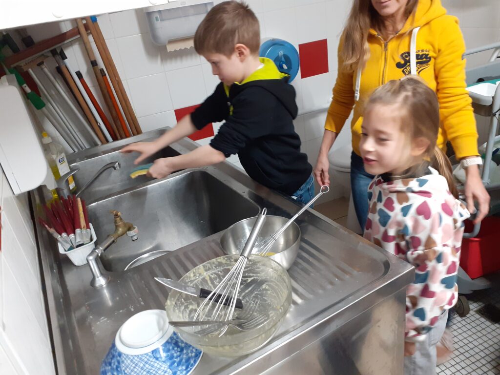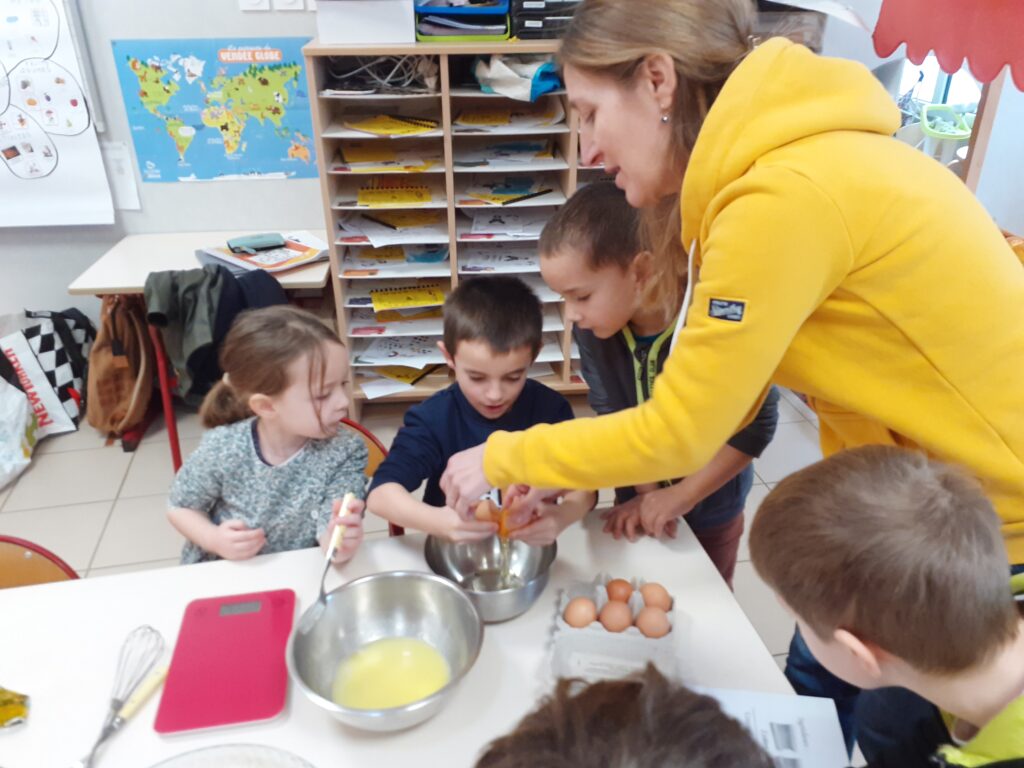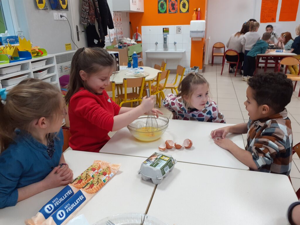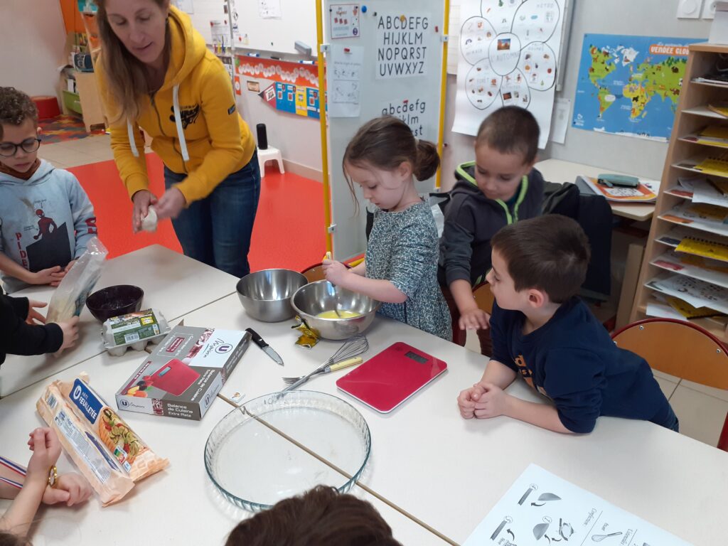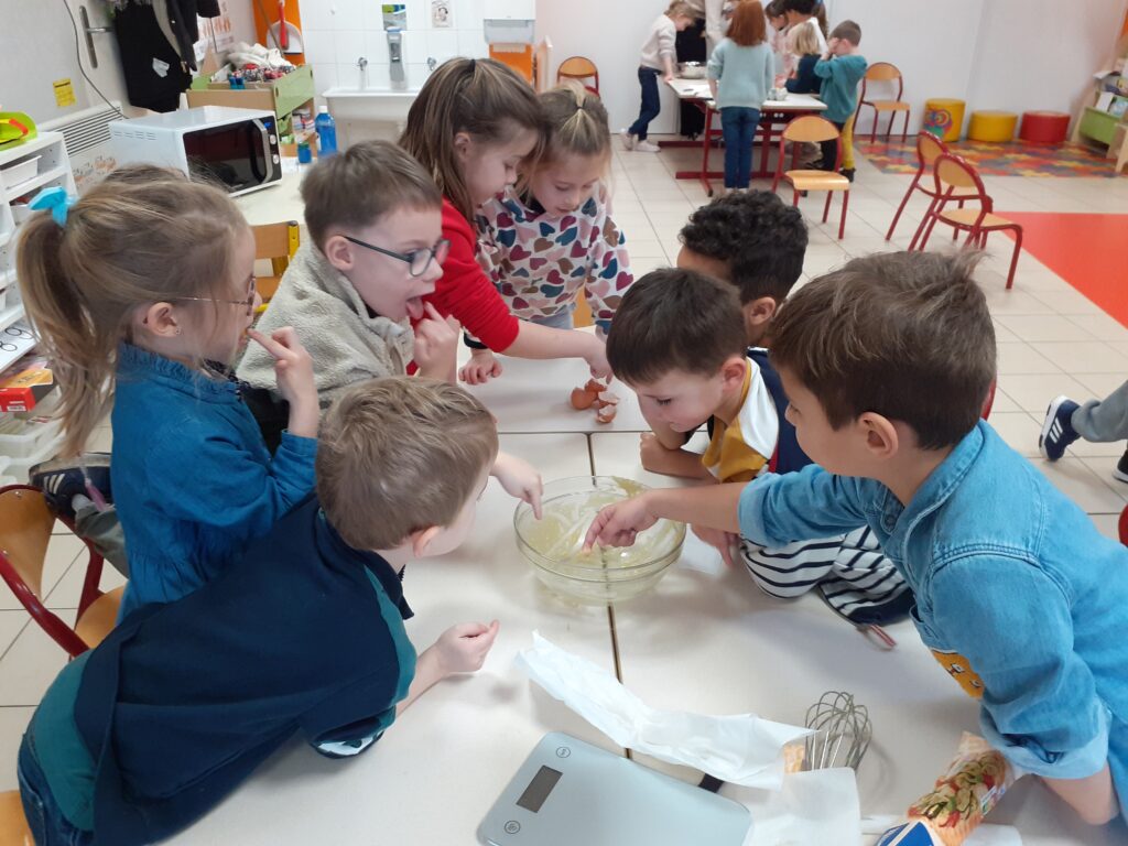 Une fois la recette terminée, place à la cuisine ! Les enfants ont mesuré, mélangé avant de cuire la galette. Un beau moment d’apprentissage où l’écriture, la coopération et la gourmandise se sont rencontrées !