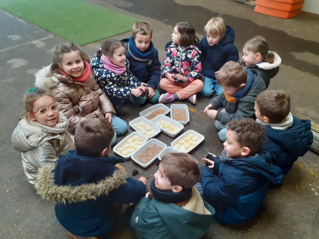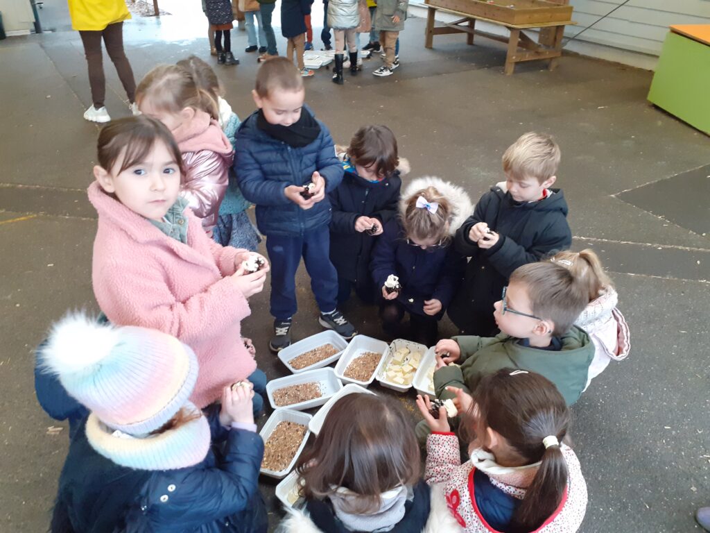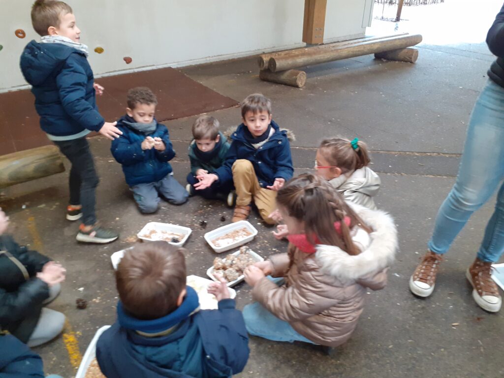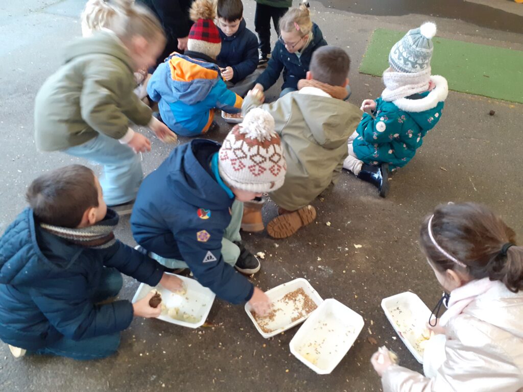 Lors d’une séance d’école dehors, les enfants de MS et GS ont réalisé des boules de graisse pour nourrir les oiseaux.