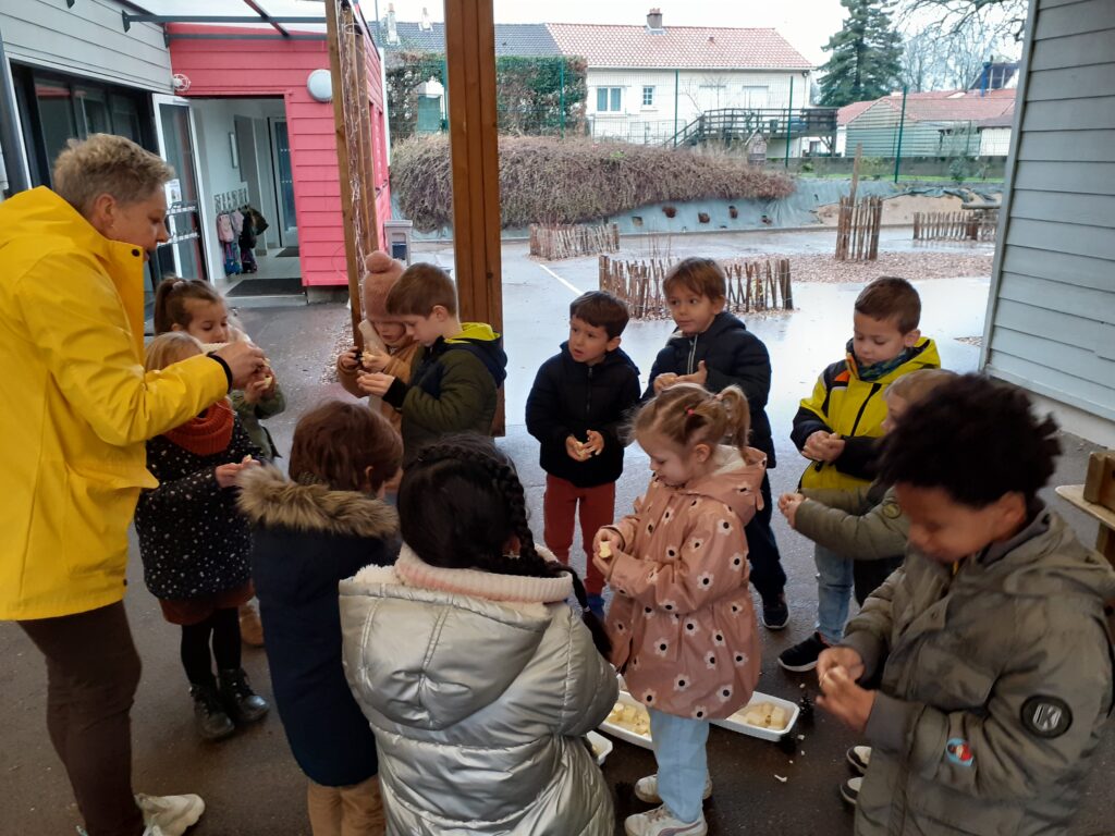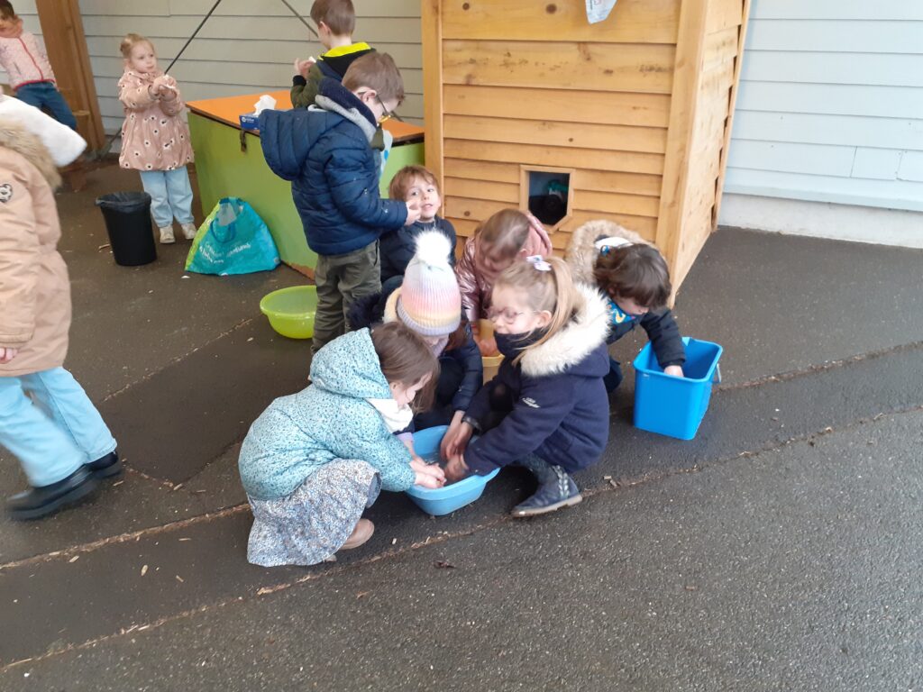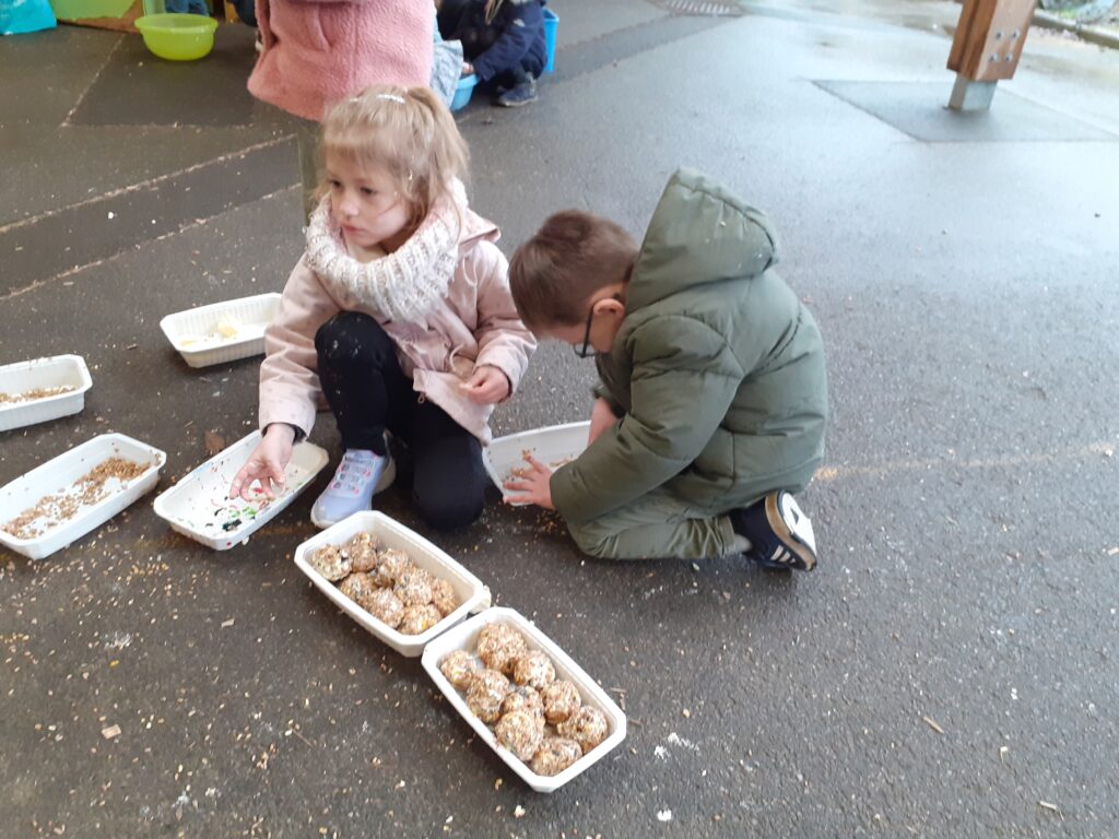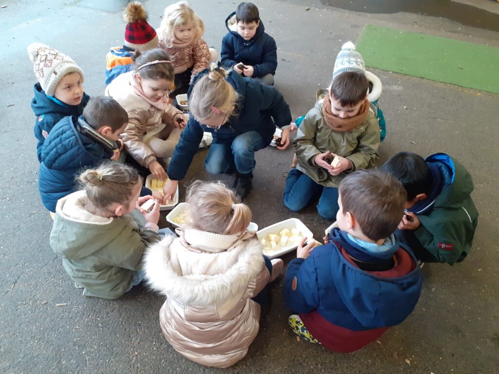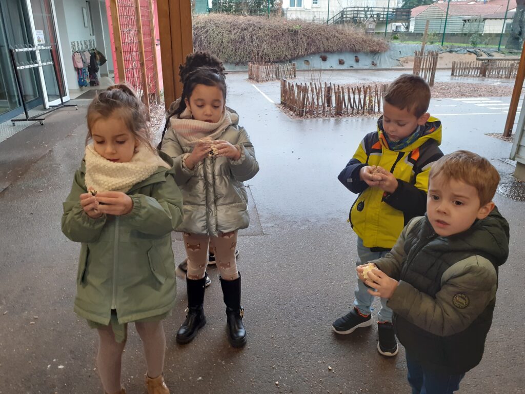 Lors d’une séance d’école dehors, les enfants de MS et GS ont réalisé des boules de graisse pour nourrir les oiseaux.