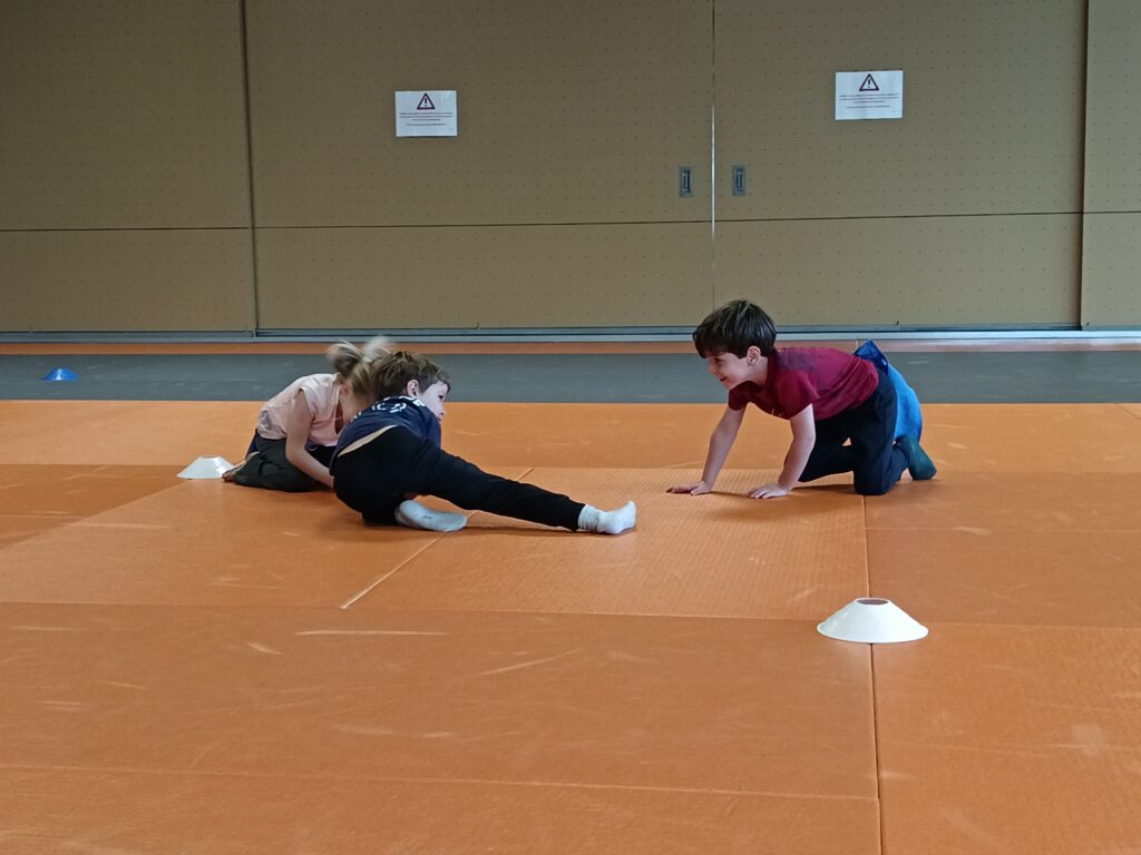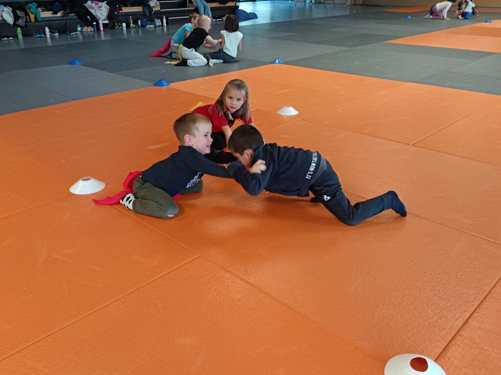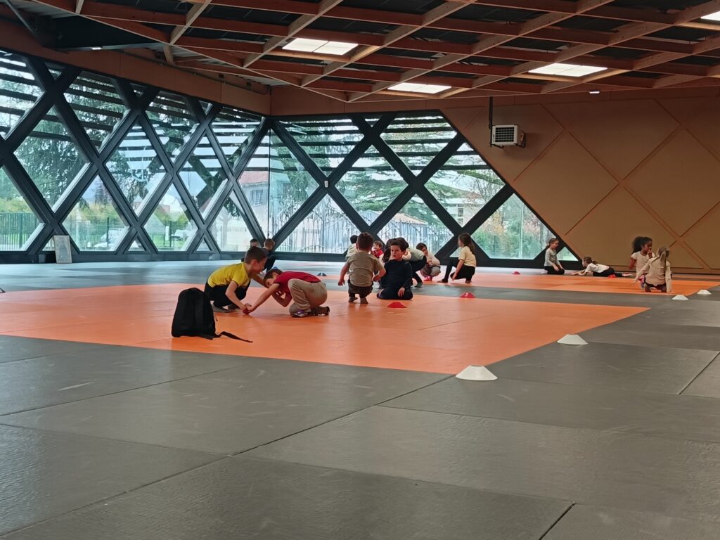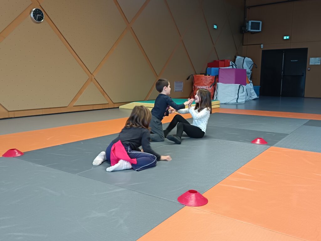 Pour cette seconde période de sport, nous allons au dojo de Massabielle pour pratiquer les jeux d’opposition. Nous faisons de petits combats dans lesquels il faut faire chuter son adversaire ou lui prendre des pinces accrochées à ses vêtements.