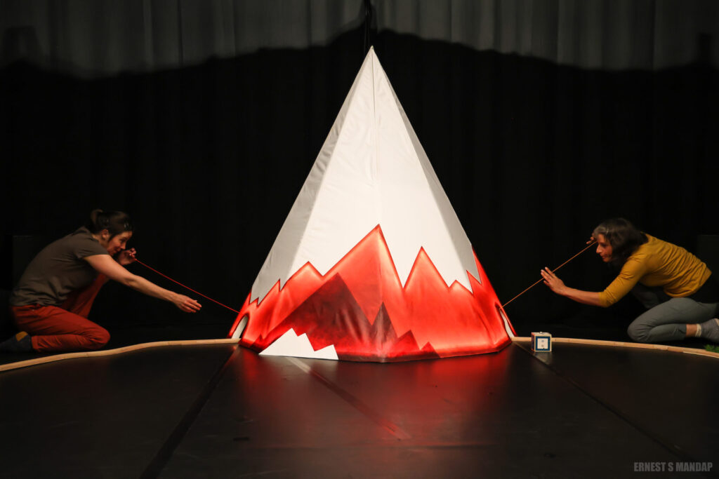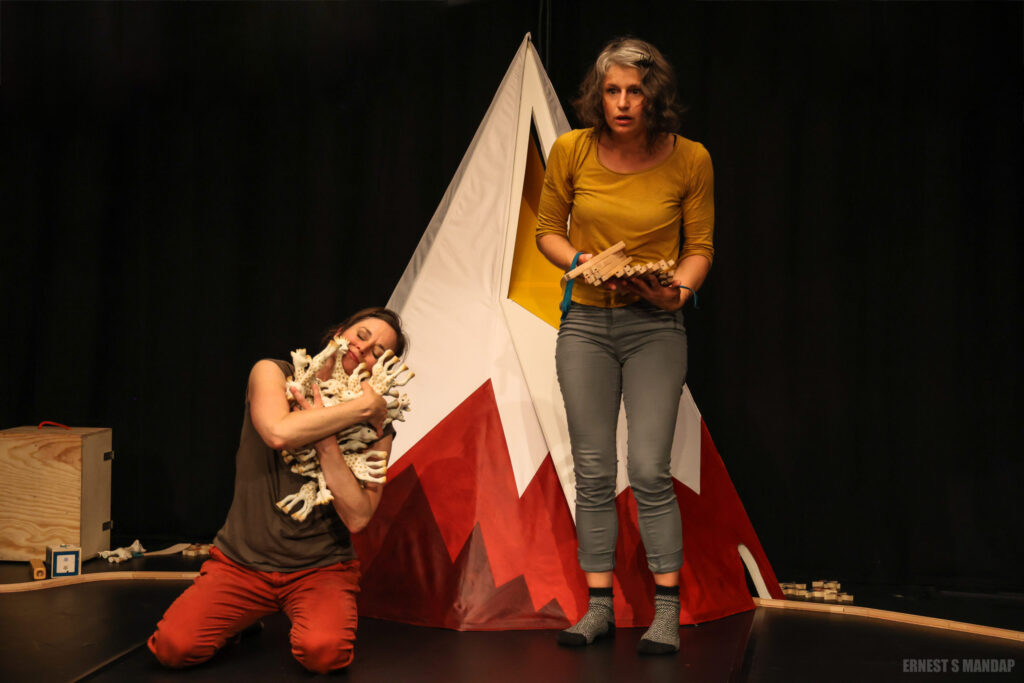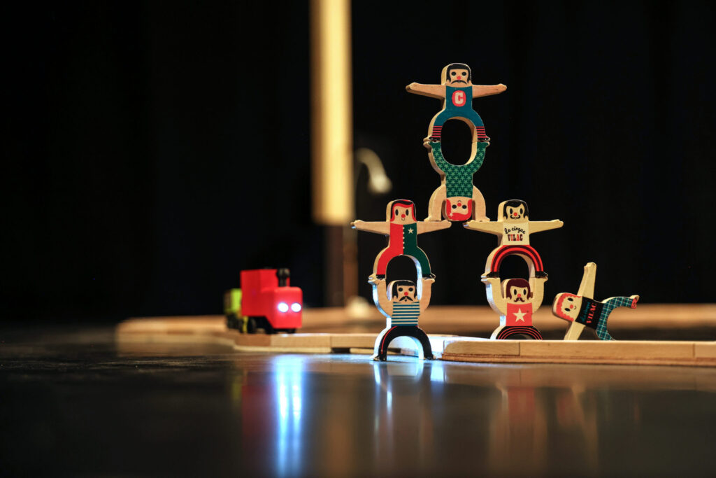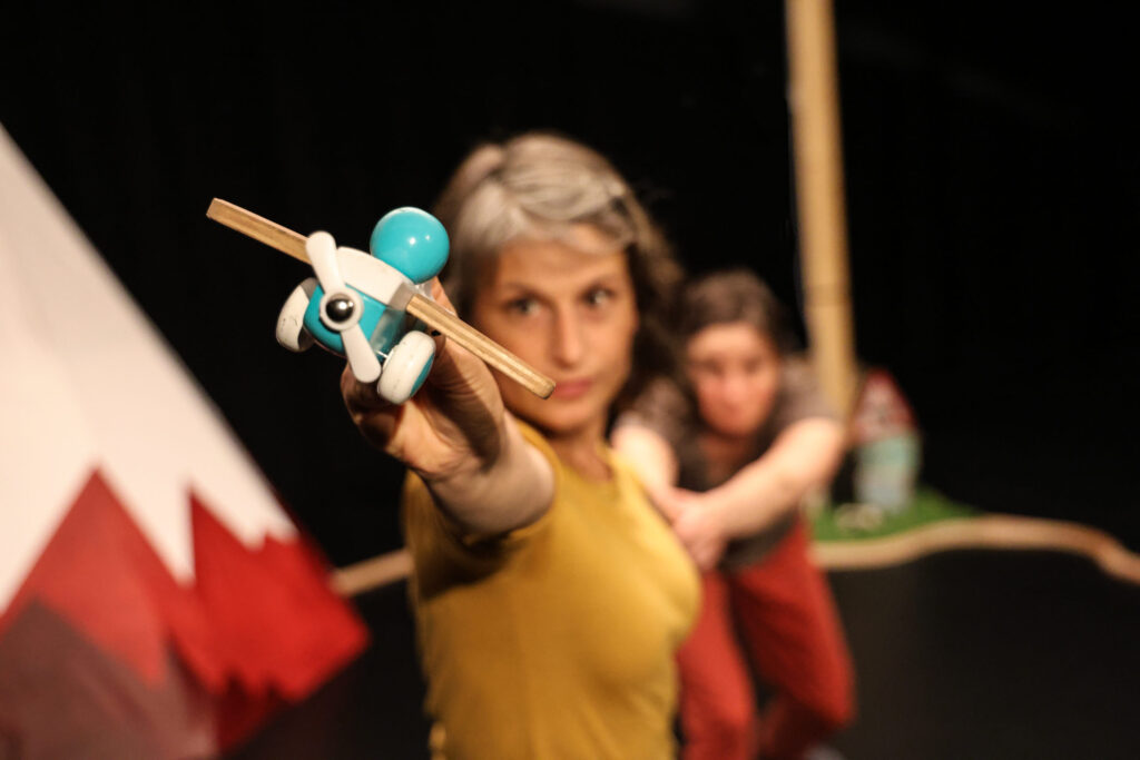 Partant de cela, les comédiennes ont inventé une scène mêlant gestes, bruitage, musique et manipulation d’objets, notamment de jouets.